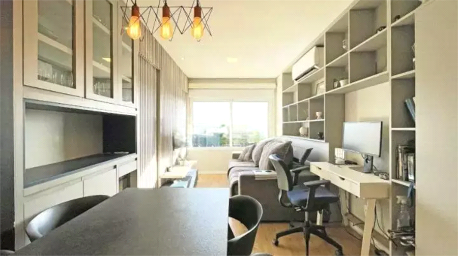 Apartamento tipo studio, com ambiente integrado de estar, dormitório e cozinha, 1 banheiro social e 1 vaga de garagem.
