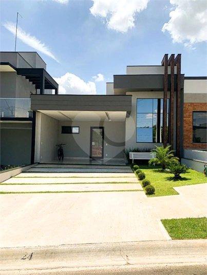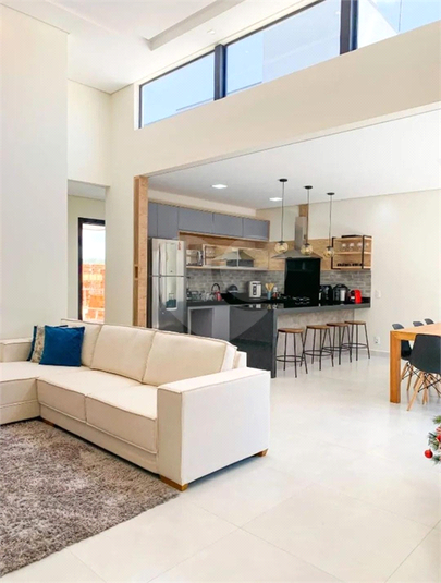 Casa térrea moderna no Condomínio Mantova, com pé-direito de 4,50 metros e ambientes totalmente integrados. Três suítes com alto padrão de acabamento e casa completa em planejados.