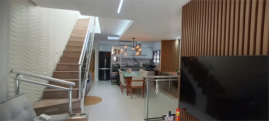 No térreo temos 2 vagas de garagem, já no primeiro pavimento contempla, varanda, lavabo, escritório, sala de visita contígua a sala de jantar e cozinha conjugada, com armári...