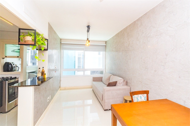 Apartamento com 1 dormitório, living 2 ambientes, banheiro social, 1 vaga de garagem coberta.