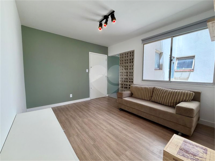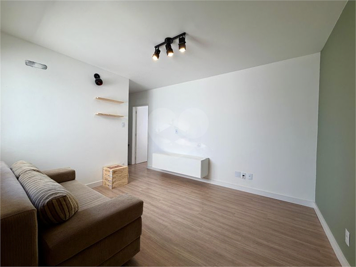 São 45m² de área privativa, mobiliado, com sofá e rack no living, dormitório com roupeiro e cama, cozinha com ...