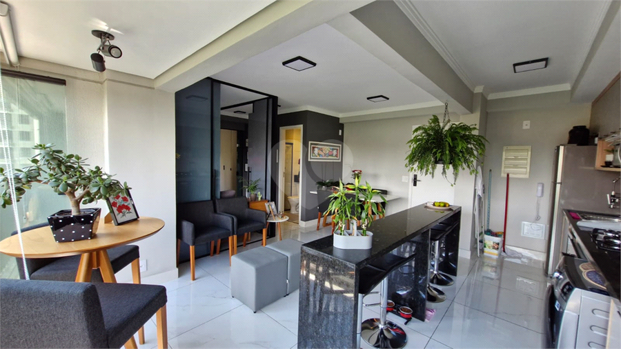Sala integrada à cozinha e à varanda envidraçada.