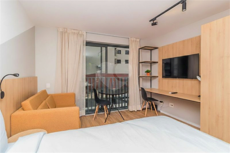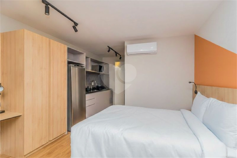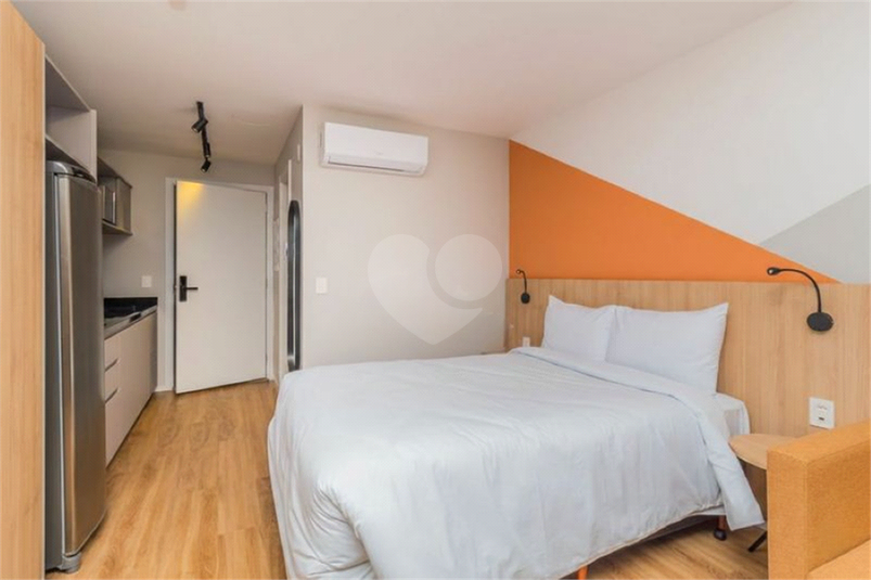 Apartamento studio, com 1 quarto/sala, banheiro e cozinha, totalmente mobiliado, com todos os eletrodomésticos, utensílios, armários aéreos, guarda roupa, cama baú, sofá cama para solteiro. São 25 m² de área privativa, sol da manhã.