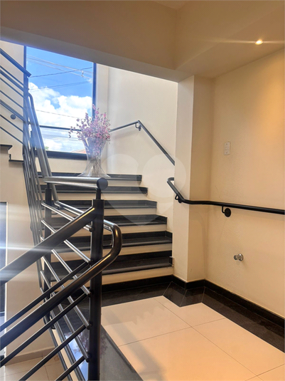 Entrada térrea para recepção com portão fechado, porta de vidro, e escadaria em porcelanato e granito.