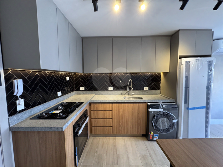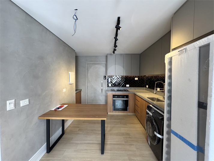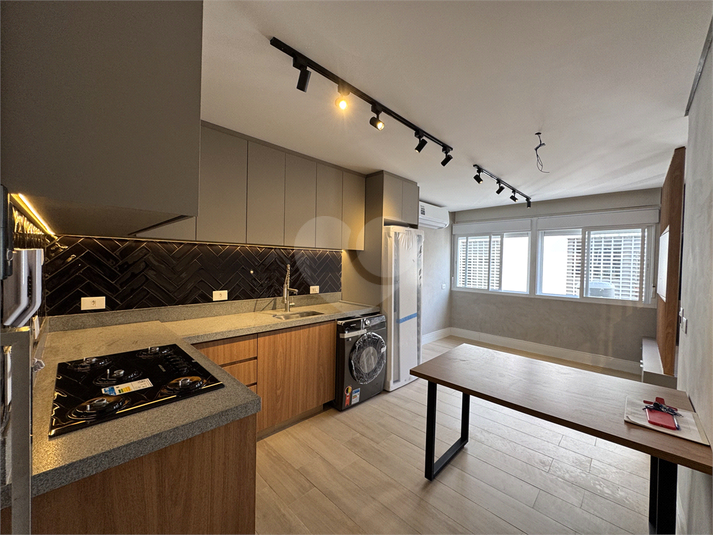 Unidade totalmente reformada, entrada pela cozinha, sala e quarto divididos com painel giratório, armários planejados e banheiro.