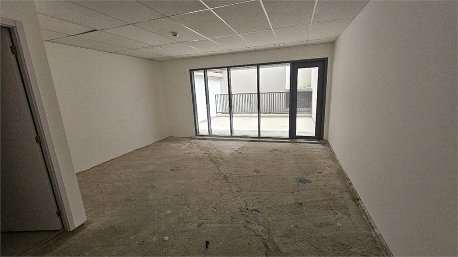 Sala comercial de 45m² com e banheiros e 2 vagas de garagem.