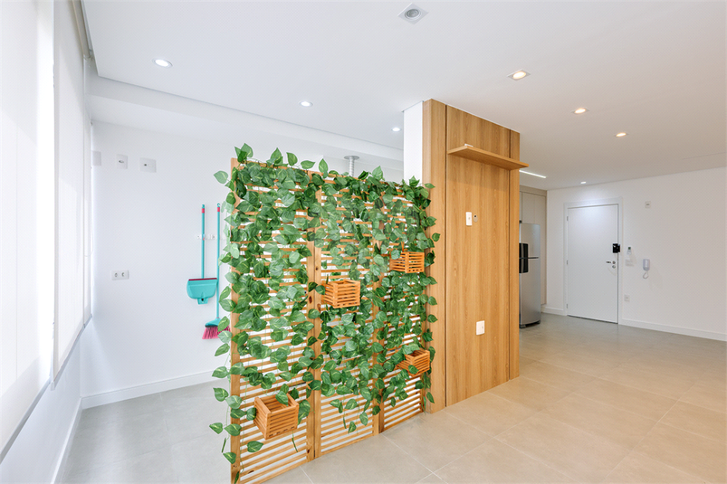Lavanderia dividida por uma porta e por um painel verde, o que p...